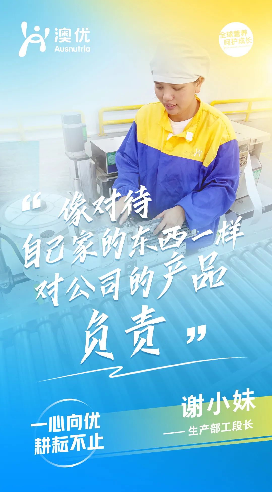 谢小妹说:“澳优给我家一样的感觉,所以我对公司也要像对待家一样,尽自己的全力将这份工作做到最好。”