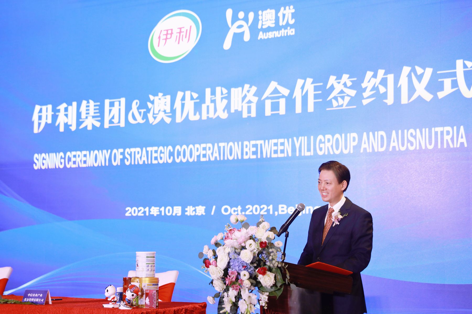 △伊利集团董事长兼总裁潘刚在签约仪式上讲话。
