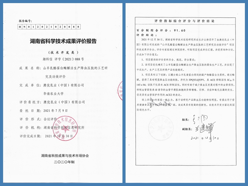 再添佳绩!近日,澳优联合华南农业大学共同完成的“山羊乳酪蛋白酶解法生产降血压肽的工艺研究及功效评价”项目被评定为最高级别“国际领先”水平,澳优硬核科研实力再获权威认证!