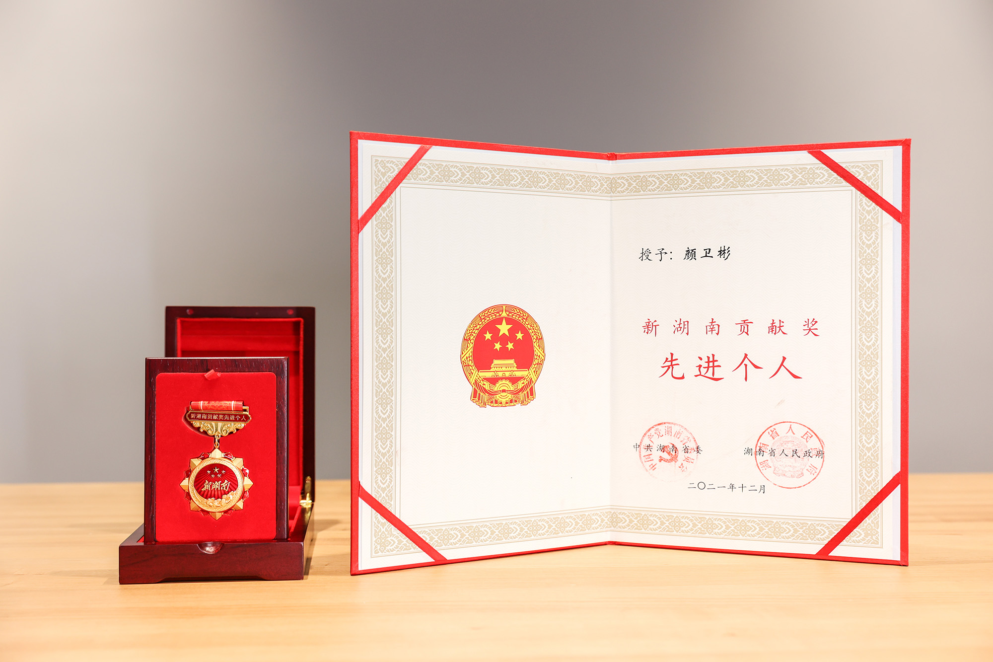 △澳优董事长颜卫彬第一届“新湖南贡献奖先进个人”获奖勋章及证书。