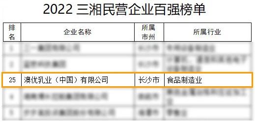 12月30日,湖南省人民政府举行2022三湘民营企业百强榜新闻发布会,发布了“2022三湘民营企业百强榜”,并印发《2022年三湘民营企业百强调研分析报告》。省委常委、省委统战部部长、省非公有制经济工作领导小组副组长隋忠诚,省人民政府副省长秦国文出席并发布新闻。榜单显示,澳优位列第25位,蝉联食品制造业第一。
