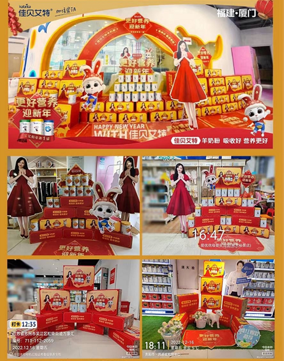 聚焦门店形象建设,佳贝艾特通过“终端生动化变装”、“创意整堆PK赛”等一系列举措夯实门店活动氛围,调动终端参与。其中“创意整堆PK赛”号召门店导购围绕新春主题打造创意堆头,并在活动指定链接中上传进行“投票比拼”,该活动互动热度高涨,仅上线一周参与投票数就超过了126万。