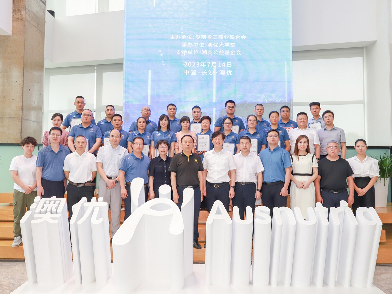 7月14日,首期“梅山商俊”新化县年轻创业人才培养计划(以下简称:“梅山商俊”人才培养计划)结营典礼在长沙举行。湖南省工商联副主席、湘商公益基金会理事长、澳优董事长颜卫彬,省工商联二级巡视员谢明亮,省工商联社会发展处处长孙细飞,省工商联社会发展处副处长欧阳春,新化县委常委、副县长廖喜明,县委常委、县委统战部部长杨铁贞,县政协副主席、县工商联主席陈永松,湖南省政协经济科技委员会办公室调研员翁华明,省工商联社会发展处一级调研员秦联辉,新化县委统战部常务副部长伍石军,湖南省工商联社会发展处二级主任科员徐洁,澳优集团党委书记、中国区副总裁刘育标,澳优中国区人力副总监、澳优大学堂教务长肖艳等领导,以及近20位参与首期培养计划的学员出席,共同见证这一激动人心的收获时刻。