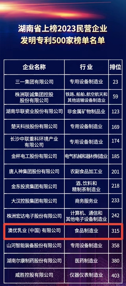 10月19日,由全国工商联、湖南省人民政府共同主办的2023全国民营企业科技创新与标准创新大会——知名民企助力现代化新湖南建设大会在长沙举行。会上发布了2023民营企业发明专利500家榜单。凭借在科技创新领域的出色表现,澳优荣誉登榜,成为湖南唯一上榜乳企。
