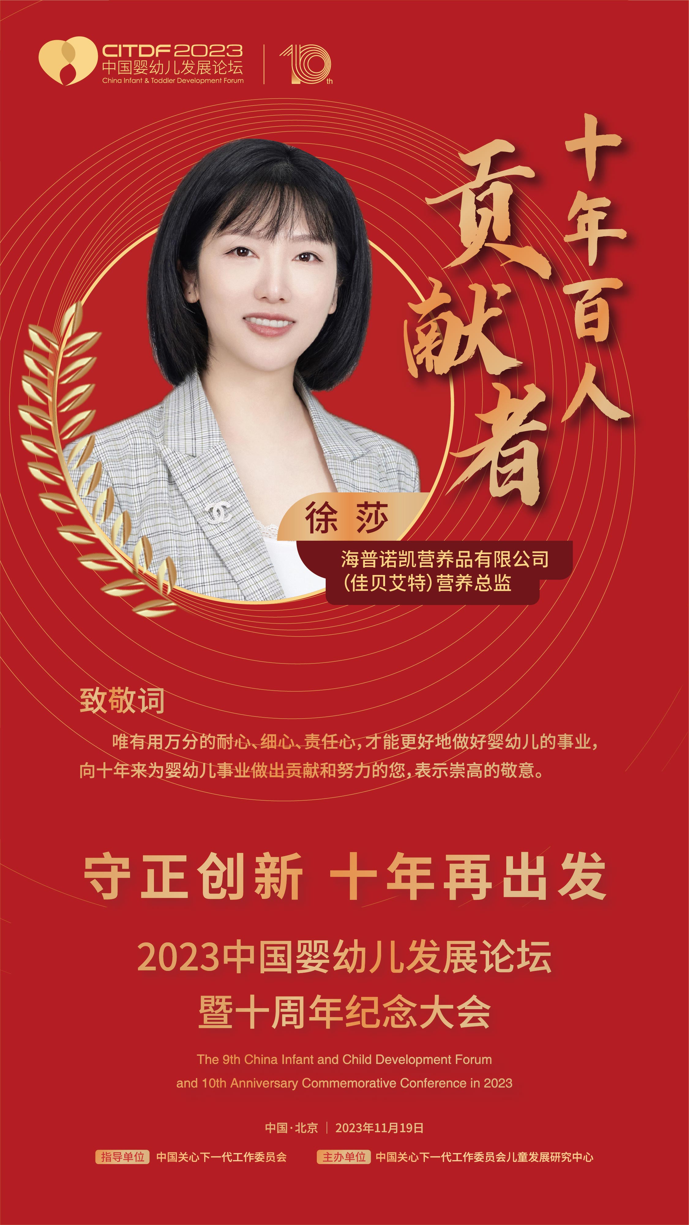 11月19日,由中国关心下一代工作委员会指导,中国关心下一代工作委员会儿童发展研究中心(简称:中国关工委儿研中心)主办的 2023 第九届中国婴幼儿发展论坛暨十周年纪念大会在北京召开。大会举行了“十年百人-婴幼儿事业贡献者”推选致谢活动。佳贝艾特获得“十年合作伙伴-婴幼儿事业发展贡献单位”荣誉,佳贝艾特营养总监徐莎获得“十年百人-婴幼儿事业发展贡献者”荣誉。