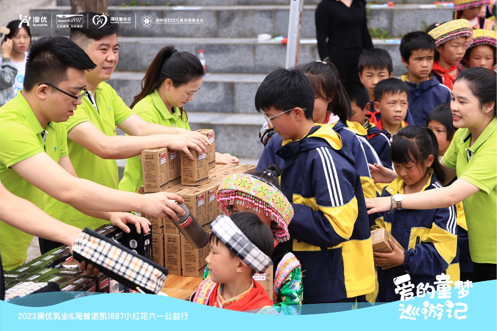 5月31日,六一儿童节前夕,澳优携手澳优基金会及旗下品牌海普诺凯1897,联合湖南省妇女儿童基金会,联动湖南邵阳荷天下系统经销商宝贝e家孕婴童连锁一起翻山越岭,走进湖南省隆回县虎形山瑶族乡草原学校,暖心开展“爱的童梦巡游记——2023澳优乳业&海普诺凯1897小红花六一公益行”活动,为草原学校的孩子们送去关怀与陪伴。这也是澳优连续第二年在儿童节到来之际开展公益助学活动,以爱心呵护学子们健康快乐成长。